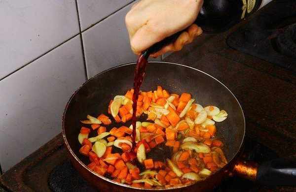 将蒜头切片、红萝卜切丁后,取平底锅开中火,以煎牛肉的油热锅,倒入蒜片及红萝卜拌炒,炒至红萝卜变软后,再倒入红酒加以拌炒,炒至水分略为收干。
