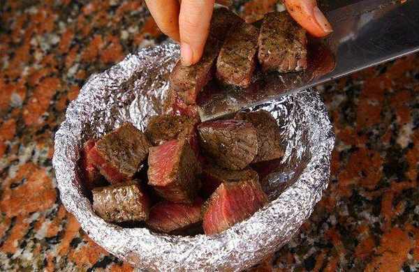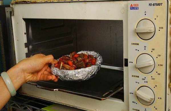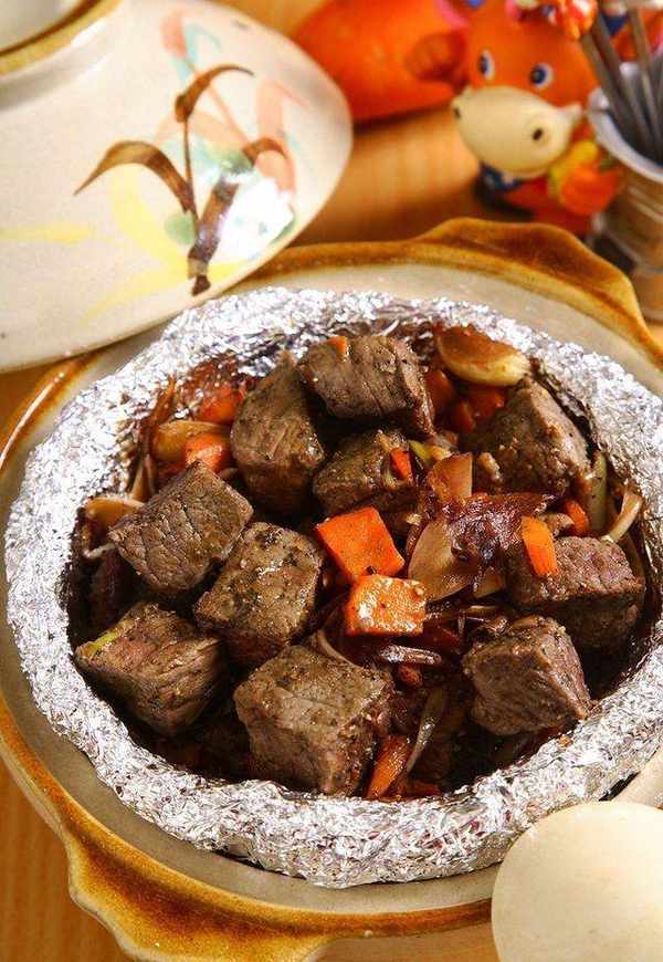 取一个宽口瓷碗,并将铝箔纸铺于碗中,将碗包起来,放入切成骰子块状大小的牛肉。