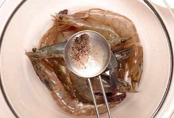 Step3.把米酒和黑胡椒与虾拌匀,放入雪柜20分钟。Step4.用厨房纸印干虾身后,把虾扑上生粉。