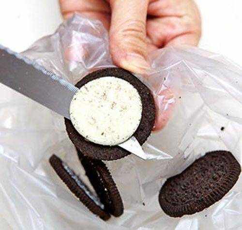 将OREO饼干上、下拆开,用面包刀取出内馅,把饼干放入塑胶袋用擀面棍均匀压碎。