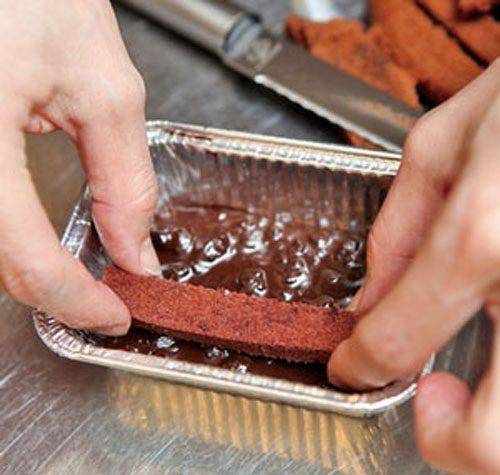 夹层以切成长条状的巧克力海绵蛋糕取代,吃起来较绵密。