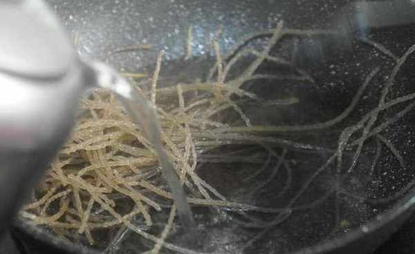 另起锅,放入少许油,将浸泡好的红薯粉丝倒入锅里,加入盐,快速翻炒,因为红薯粉很容易粘锅,所以手法要快,油稍微多一点。