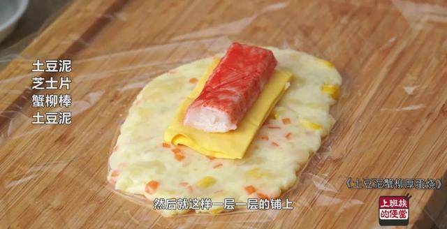 然后就这样一层土豆泥,一层芝士片,一根蟹柳棒,再放一层土豆泥。