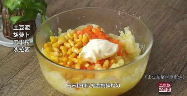 蒸熟的土豆压成泥,加烫熟的胡萝卜、玉米粒和沙拉酱搅拌均匀。