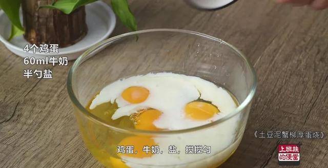 再来调个蛋液,4个鸡蛋,60ml牛奶,半勺盐,搅搅匀。