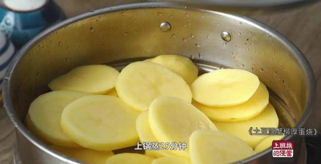 准备两个大土豆削皮切片,上锅蒸25分钟。