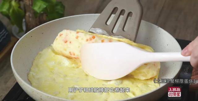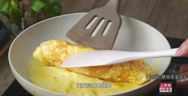只要一点点油,倒蛋液,稍微凝固后放上土豆泥,用铲子和硅胶棒把它卷起来。