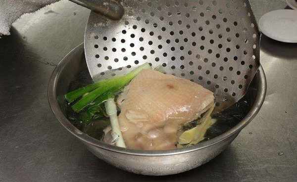 将去骨大鸡腿与食材捞出、倒入冰块水中,冰镇让肉汁呈现冻状。
