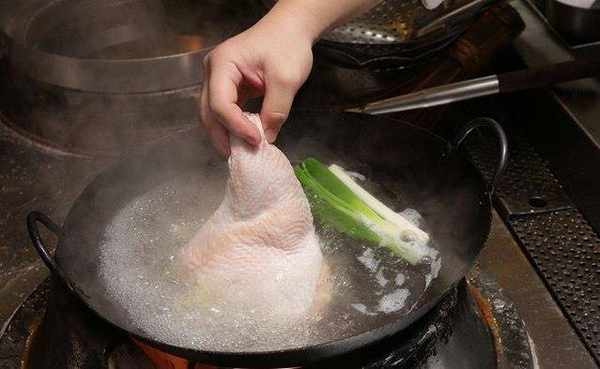 起一锅水煮滚,加入去骨大鸡腿、葱、姜、绍兴酒、盐,转小火煮15分钟后关火。