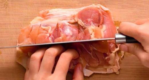 姜去皮,切薄片。蒜头分成数瓣。在鸡扒上轻轻切几刀。