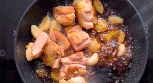 放入冰糖、酱油、鸡块及米酒,以中火炒至酱汁收干。