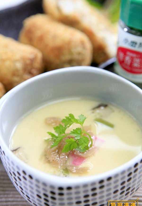 水5大匙加入柴鱼粉1大匙、酱油,与太白粉勾芡,淋在蒸好的茶碗蒸上即完成。