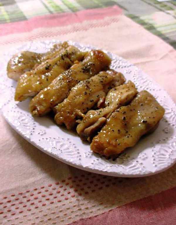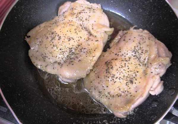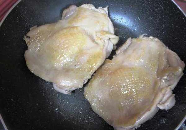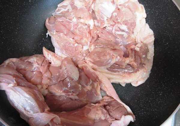 (2)中火将鸡皮煎至金黄色。