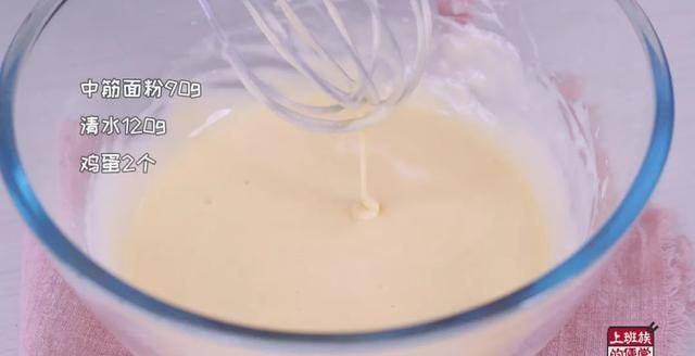 面糊的调配很简单:90g低筋面粉加120g水,搅拌后加2个鸡蛋,浓稠度大概是这种可以呈柱状流下,滴落还有痕迹的感觉。