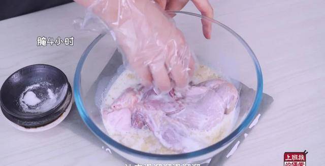 加蒜末除异味、白胡椒粉增香味、加盐有滋味,再来一大杯牛奶,让肉质滑嫩嫩,抓匀后腌4小时。