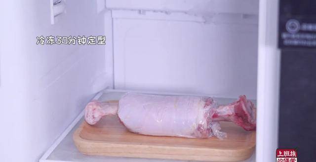 鸡腿放冰箱冷冻30分钟定型。