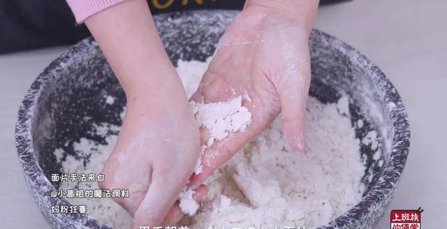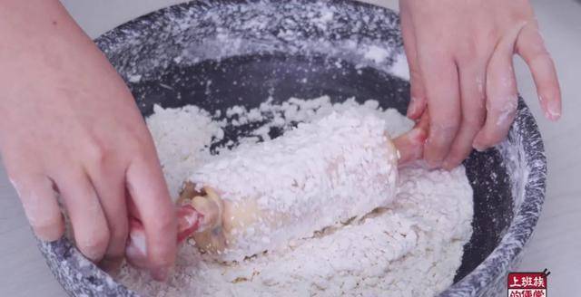 为了对付这个大鸡腿,特意学了新的裹粉手法:把150g中筋面粉、100g红薯淀粉、1/4勺小苏打、1勺胡椒粉和适量食盐加一起搅拌均匀后,再把水少量多次慢慢的加入面粉中,用手朝一个方向搓出小面片。