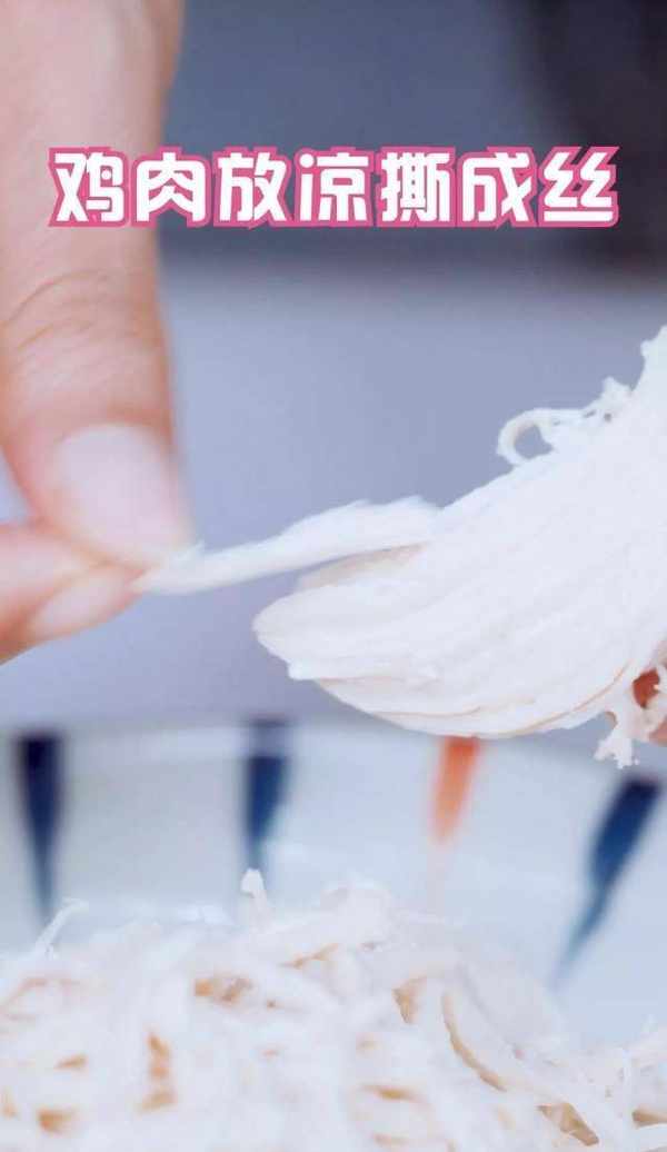 冷水入锅,加入葱段姜片去腥,煮15分钟,中途撇去浮沫,煮到鸡肉变白,插入筷子,无血水即可,捞出后将鸡肉放凉,撕成丝;