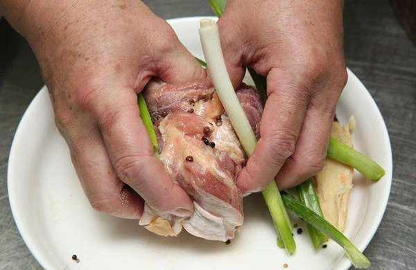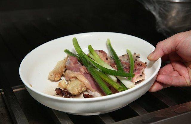 中姜以刀背拍约34下至中姜微扁且见姜肉备用。接着放入葱段、中姜、花椒、八角,以手均匀抹上鸡腿。