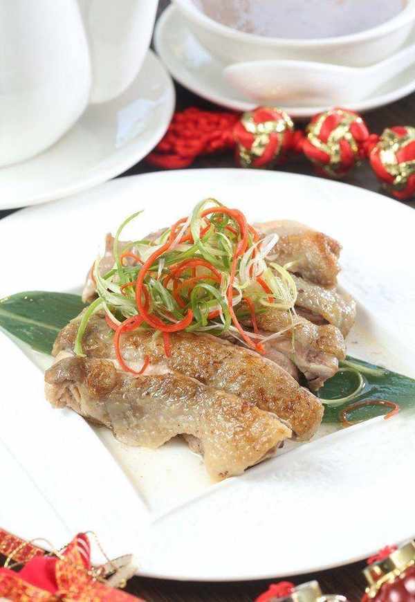 起油锅开小火,放入蒸好的鸡腿煎到表面呈金黄色即可沥油取起。切块后盛盘放上辣椒丝、葱丝即完成。