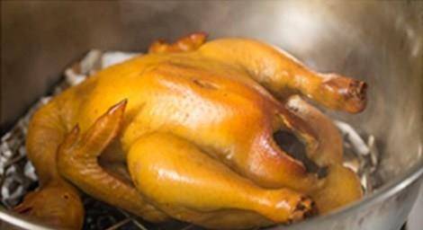 Tips:蒸鸡熟后要吹至干身才熏,否则鸡身太湿,熏时不易上色。