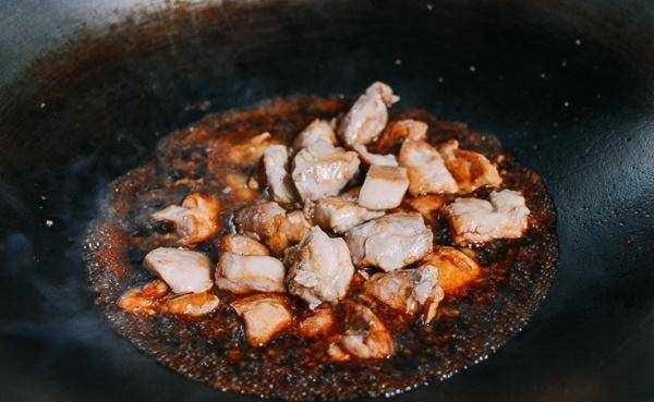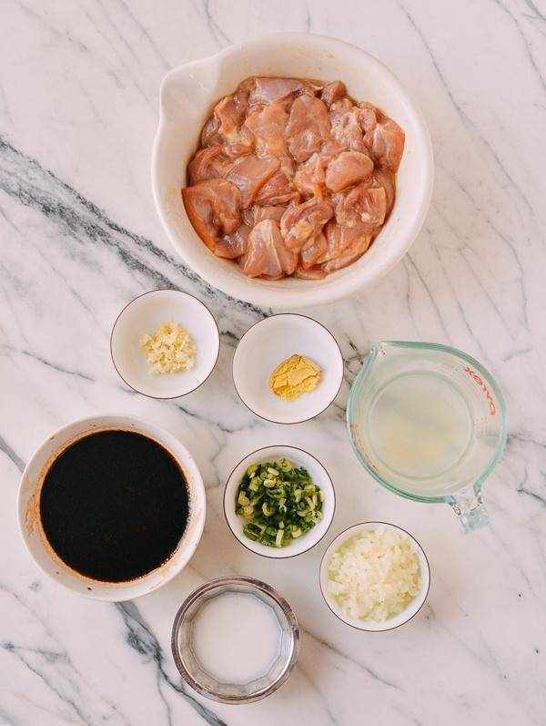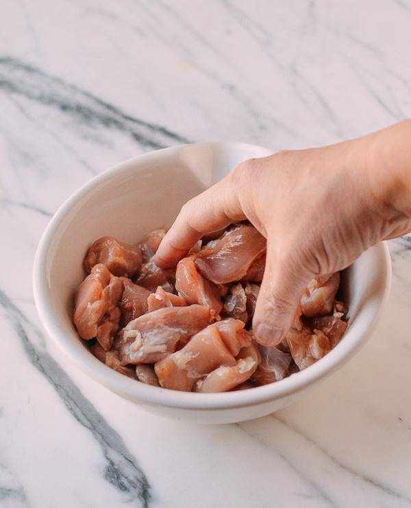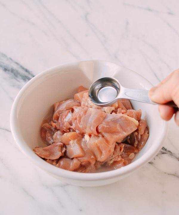先把鸡肉腌一下。将3汤匙水和1茶匙酱油与鸡块混合,用手糅合,直到鸡吸收了所有酱汁。在鸡肉中加入水和酱油(尤其是使用鸡胸肉的情况下)会使鸡肉变得湿润而柔嫩!