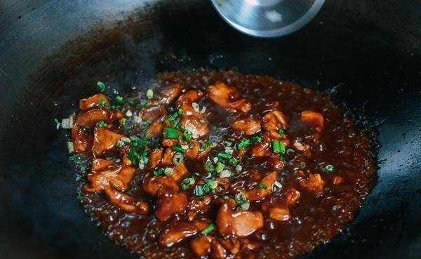 2汤匙酱油、1茶匙老抽、1茶匙米醋或苹果醋、3汤匙深红糖、半杯温鸡汤或水、半茶匙芝麻油、八分之一茶匙白胡椒、3汤匙植物油、1片生姜0.5厘米厚,用刀或切肉刀捣碎(可选)、2瓣大蒜,切碎、四分之一杯碎洋葱、2汤匙好的波旁威士忌、1汤匙玉米淀粉,加入2汤匙水、1个葱,切碎