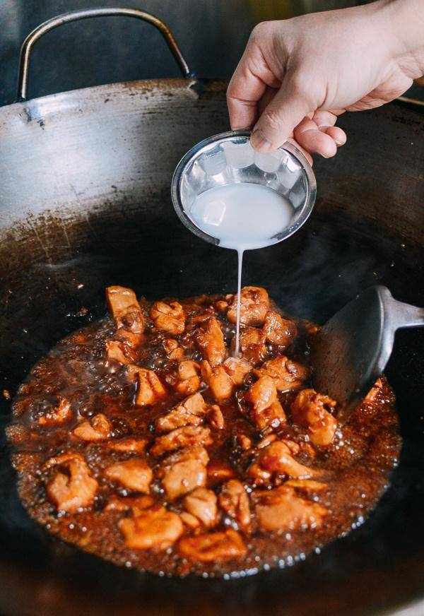 一旦鸡肉吸收了酱汁,将2茶匙玉米淀粉混合到鸡肉中,直到充分混合并放在一边。