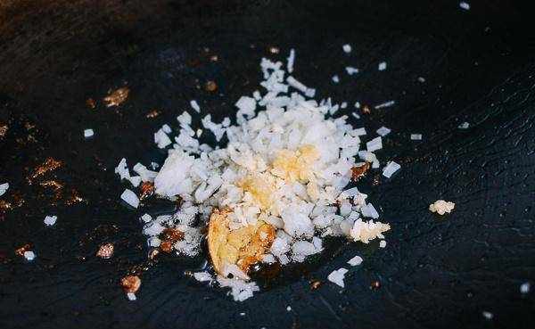 将锅放回中火,立即加入姜(如果使用)、大蒜和洋葱末。