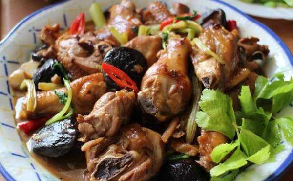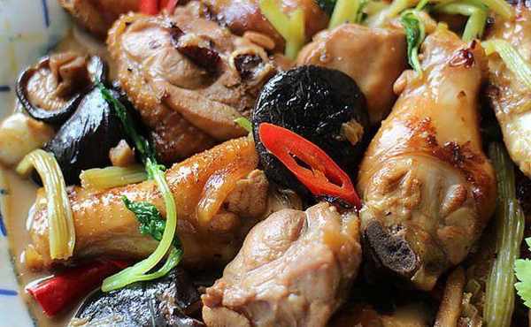 锅里只需放少少的油,我用黑鼎锅几乎可以不放油,放入腌好的鸡肉略煎,皮朝下放就会煎出许多油来,然后放入泡软的香菇,接着才倒入腌料汁,加盖中小火煮5分钟,最后放入芹菜拌炒几下就可以起锅了~简单吧!