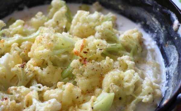 小黑鼎锅放少许橄榄油将花椰菜略炒一下,盐巴、黑胡椒、肉豆蔻略调味,为了加快速度我加入热牛奶,洒上起司后就丢到烤箱,然后可以安心的去煮下一道菜!