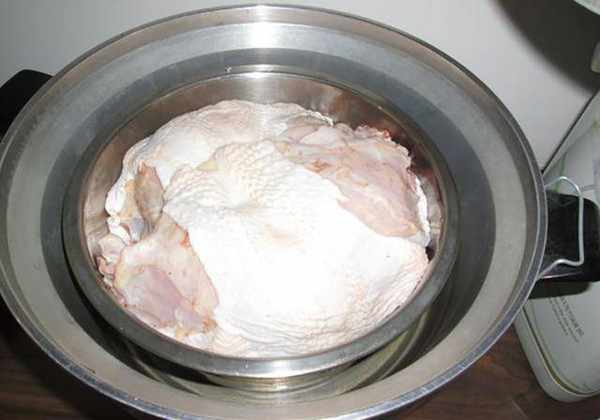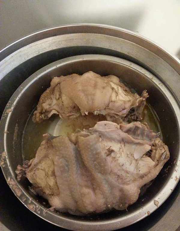 回家后,请将两副鸡胸肉清洗完毕。准备一只电锅摆得下的钢铁锅子,里面倒扣一个瓷碗公,
