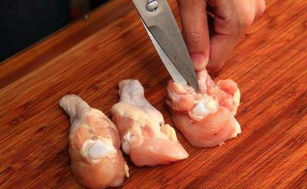 棒棒腿洗净,先以刀子或剪刀去骨,再用刀背断筋。