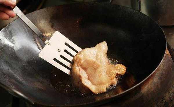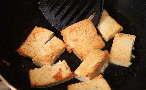 起锅开大火,放入鸡皮油煎,放豆腐单面煎上色后转小火,将爆香鸡皮取出。