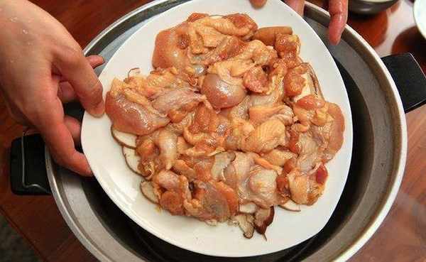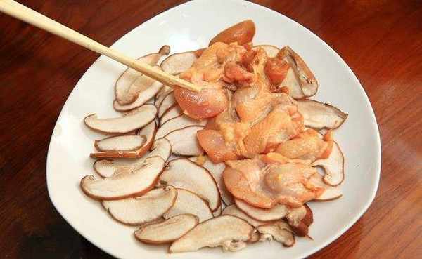 先将香菇切片铺于盘底,再将调味好的棒棒腿铺于香菇上面。