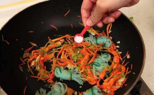 倒入金针菇、小黄瓜丝、红萝卜丝、蒟蒻丝、盐、酱油拌炒至香气出来即可。