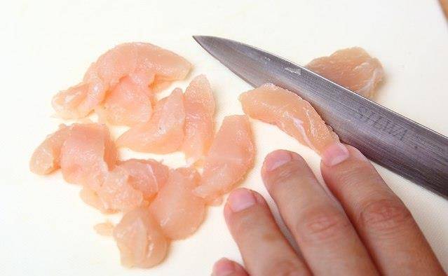 鸡胸肉切成小丁,大小块随意。