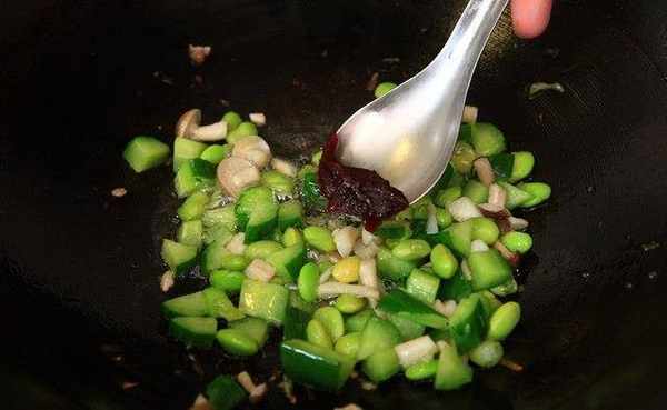 小黄瓜、猴头菇切丁。起油锅开大火,倒入适当油量,先放入猴头菇丁、毛豆炒出香气出来,接着放小黄瓜丁、豆瓣酱、香菇粉、盐炒约30秒即可。