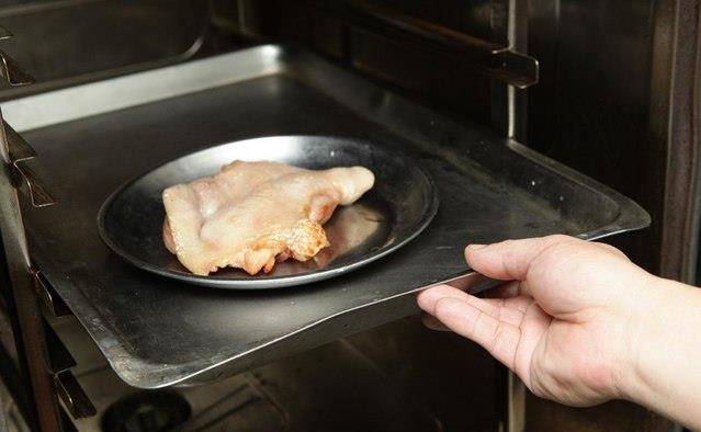 将煎过的鸡腿排送入烤箱,以上、下火180℃烤10分钟,至表面呈金黄酥脆状盛盘。
