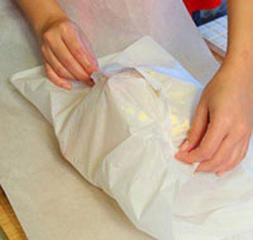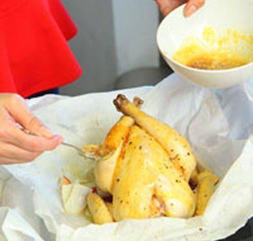 用奶油涂抹整只鸡,撒上海盐、黑胡椒,接着将烘焙纸包起密封,放入烤箱以摄氏170度烤40分钟。纸包料理因为密闭烘焙纸里蒸气循环,造成半蒸半烤的保水效果,可让鸡肉熟透又软嫩多汁、外皮香脆。