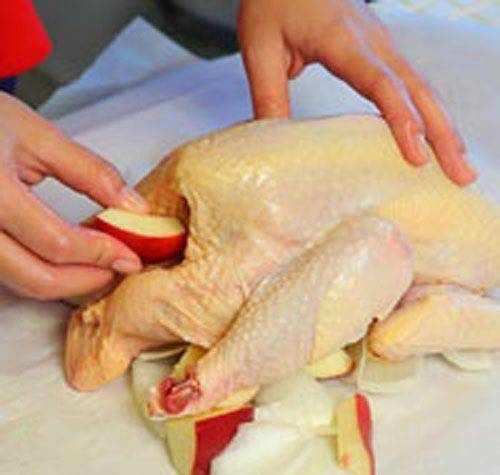 半颗苹果和洋葱切大块,大蒜压碎,平铺在2张交叉成十字状的烘培纸上,再将全鸡放置其上。剩下的苹果(不须削皮)和洋葱切丁,塞入鸡腹中。