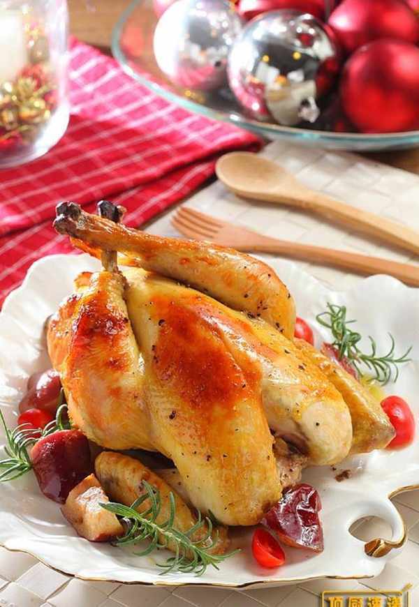 Tips:若要让烤鸡外型好看,可在一只鸡腿外皮上切出切口,再将另一只鸡腿穿过去让两腿呈交叉状固定。