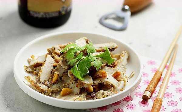 4、在锅里融化剩余奶油,加入榛果拌炒1至2分钟,让它变酥脆、散发香气,再撒于鸡胸肉上即可上菜。