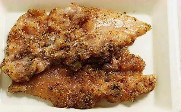 2、用擀面棍的侧面轻轻拍打鸡胸肉,让它变薄至0.6至1厘米的厚度,再放进香菜籽的碗中,加入盐、柳橙皮丝、胡椒和肉豆蔻充分搅拌。冷藏至少1小时,或达6小时为佳。
