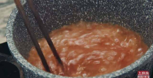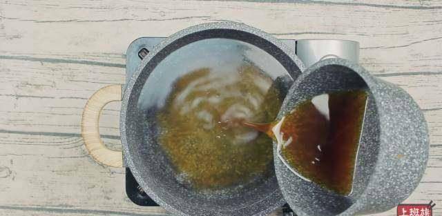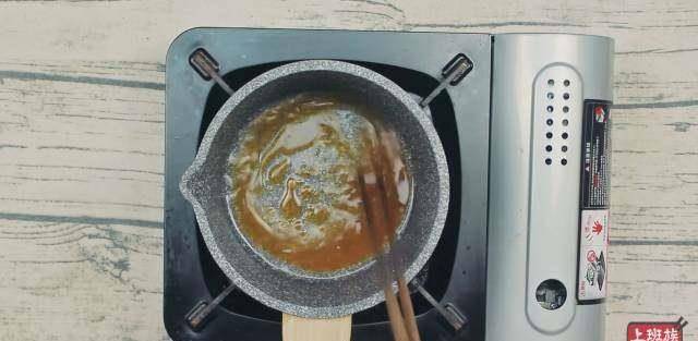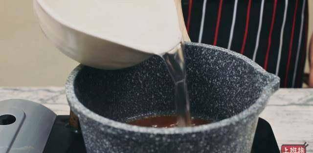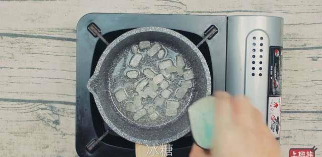 ▲接下来炒糖色,奶锅中放入2勺油,放入50g冰糖,小火慢慢炒,将冰糖炒化,颜色变为深红色,这时倒入1碗热水,搅拌均匀,糖水就做好了;