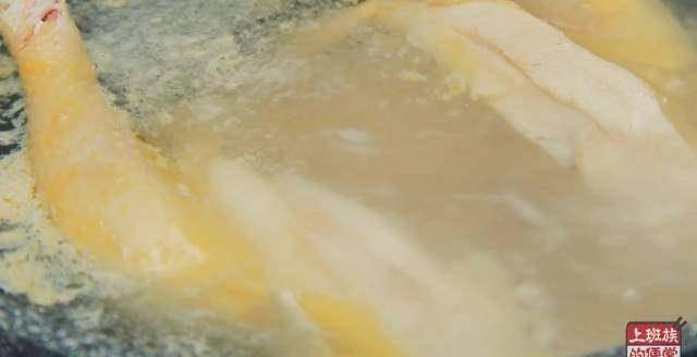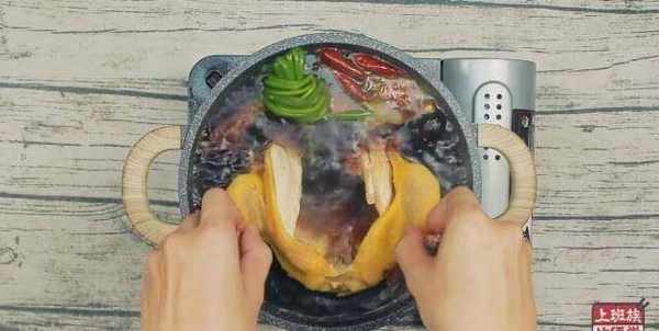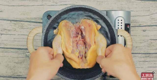 ▲整鸡处理干净后放入热水中,大火煮,煮开后捞出;