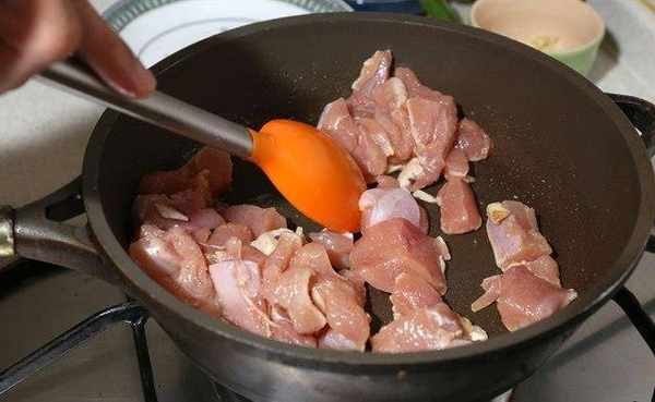 起油锅爆香切好的葱花,并将鸡肉放入拌炒。