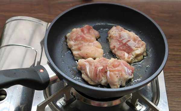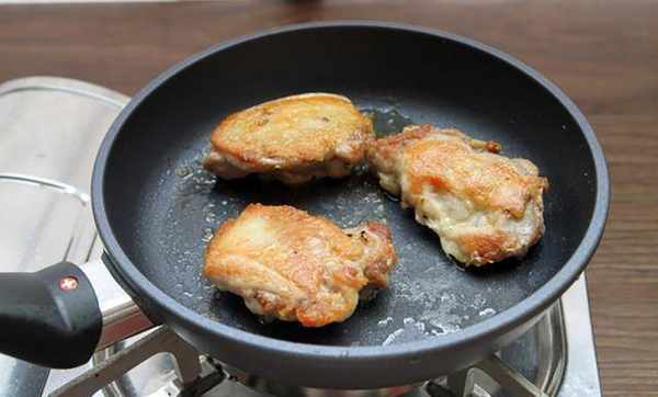 3.冷锅不放油,将鸡皮朝下,中小火煎至鸡皮呈现金黄色即可翻面。