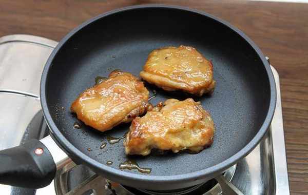6.等橙汁酱变浓稠后,放入鸡腿排不断翻面,煎至收汁即可。