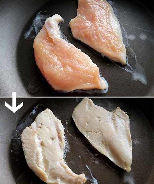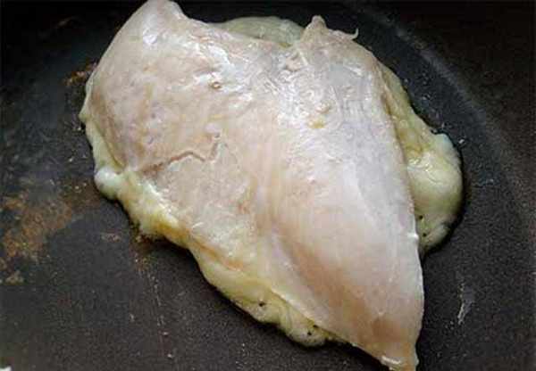 2.将鸡胸肉放入不沾平底锅中,盖上锅盖以小火闷煎至肉周围泛白后翻面,再续闷煎3~5分钟至肉熟后盛起备用。